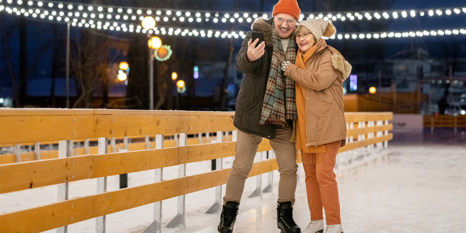 Enjoying a winter night on the ice — staying bundled up, moving carefully and using support to help prevent slips and falls.